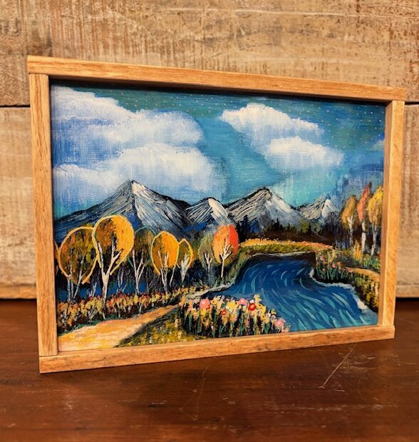 Reclaimed wood framed, 5×7″ resined block.