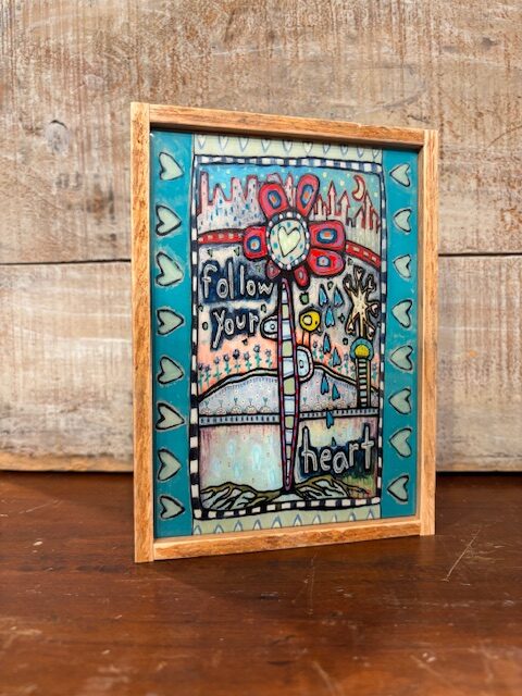 Reclaimed wood framed, 5×7″ resined block.